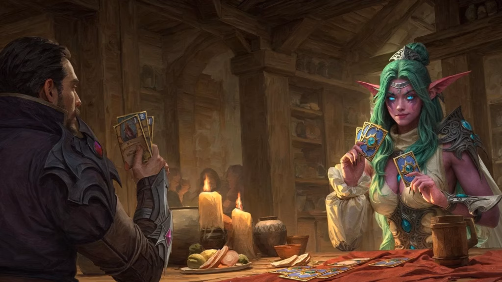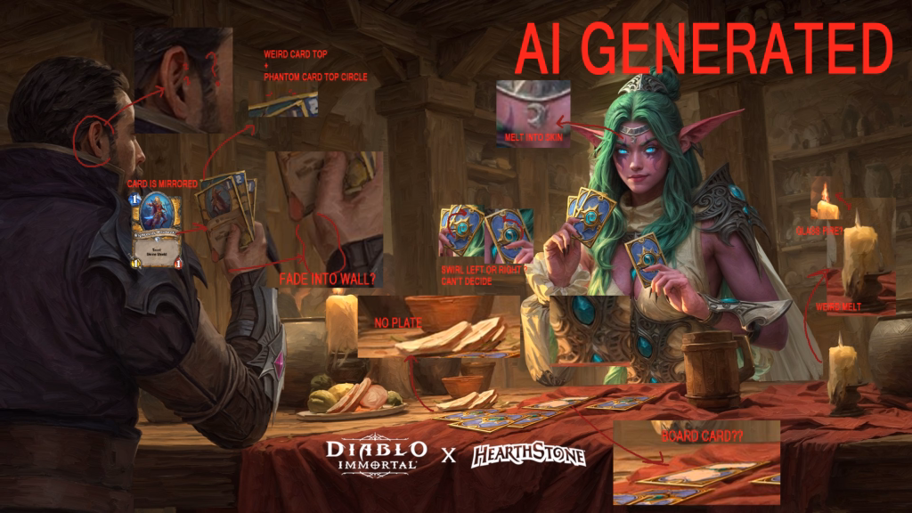 Die umstrittene Promo-Art zeigt einen Warcraft-Charakter beim Hearthstone-Kartenspiel gegen einen Charakter aus Diablo Immortal. Online-Nutzer auf Reddit sahen dort zahlreiche Inkonsistenzen: unsaubere Details wie deformierte Ohren, Hände, die plötzlich in Wände übergehen, eine Kerzenflamme aus Glas und schwebendes Brot ohne Teller – alles typische Fehler, die bei KI-Generierung auftreten können.