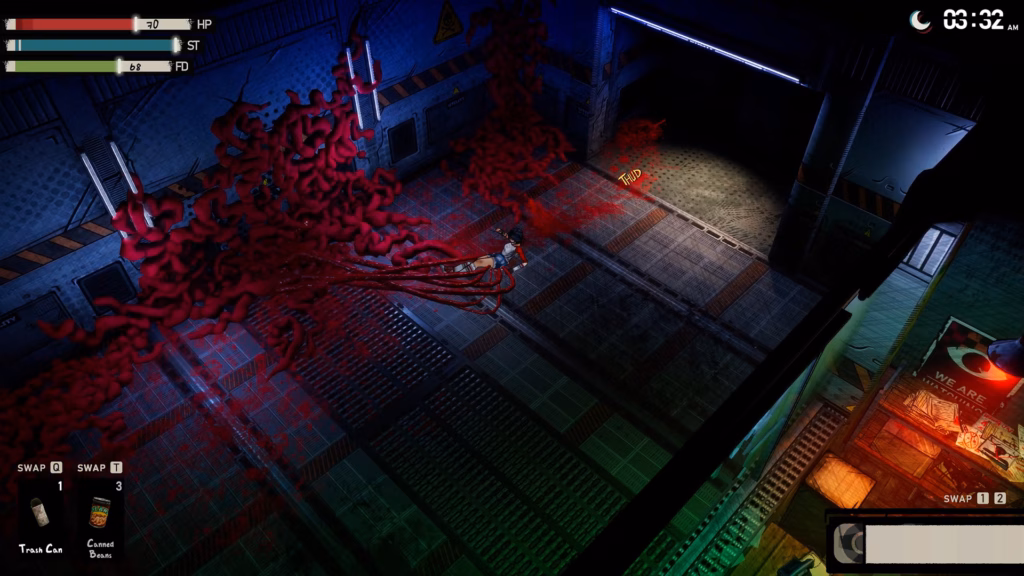 Die Demo führte mich in einen dreistöckigen, atmosphärisch dichten Dungeon, der mit seiner düsteren Stimmung sofort unter die Haut ging. Der Grafikstil ist ein absoluter Hingucker: Knallige Farben, Retro-Flair und eine Prise Camp-Gore vereinen sich zu einem Look, der an die Kultserie Stranger Things erinnert. Besonders genial fand ich die audiovisuelle Darstellung von Geräuschen – ein zentrales Element des Spiels. Beim normalen Laufen erscheint das Wort „Thud“ auf dem Bildschirm; beim Schleichen wird es kleiner, um die reduzierte Geräuschkulisse zu zeigen. In einer Welt, in der viele Gegner dich per Sound orten, ist diese Mechanik nicht nur clever, sondern überlebenswichtig. Laufen wir über Glas dann sehen und hören wir ein „Crunch“ und wenn wir einen Schuss abgeben, dann kommt natürlich ein „Bang“.