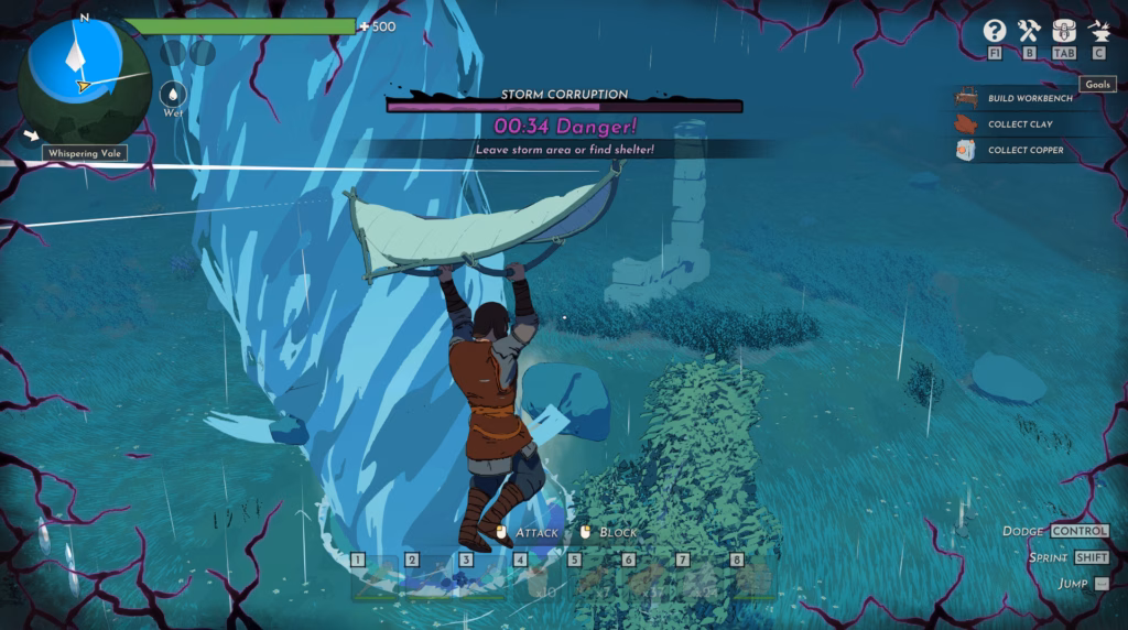 Wir tauchten in die Welt von Sorana ein – eine prozedural generierte Open World, die von magischen Stürmen geprägt ist. Als Stormforged, Helden mit der Macht, diese Stürme zu nutzen, erkundeten wir die Landschaft, sammelten Ressourcen und bauten Strukturen. Die Entwickler beschrieben Stormforge als eine Mischung aus Erkundung, Kampf, Sammeln, Herstellen und Bauen, inspiriert von Titeln wie Valheim, The Legend of Zelda: The Wind Waker und Enshrouded. Bis zu acht Spieler können im Koop-Modus zusammenarbeiten, um Basen zu errichten, Ressourcen zu sammeln und Bosse zu bekämpfen. Die Welt wirkt lebendig, mit Biomen, die durch Feuer-, Gift-, Staub- oder Wasserstürme verändert werden. Diese Stürme bieten Chancen auf wertvolle Ressourcen, bergen aber auch Gefahren wie Sturmjäger-Feinde, die aus ihnen Kraft ziehen.