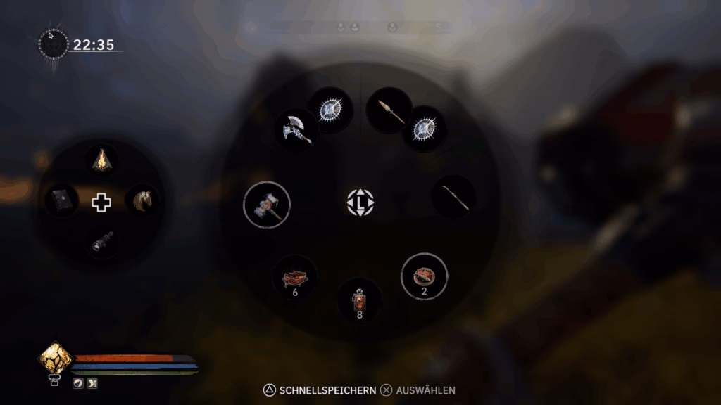 Passend zum individuellen Spielstil gibt Tainted Grail dir große Freiheit bei der Waffenhandhabung: Du entscheidest selbst, ob du eine Waffe, ein Schild oder einen Zauberspruch in die linke oder rechte Hand legst (Zweihandwaffen belegen natürlich beide). Schön ist auch, dass du bis zu vier Waffensets ausrüsten kannst, die mitten im Kampf schnell gewechselt werden können. Sobald du die L1-Taste gedrückt hältst, erscheint ein Schnellauswahlrad. Im Gegensatz zu vielen anderen Action-RPGs pausiert das Spiel in diesem Modus, was eine grandiose Option ist, um sich in Ruhe auf unterschiedliche Situationen vorzubereiten. Das Rad erlaubt dir zudem den Zugriff auf die vier Waffensets, Heilgegenstände, dein Camp, dein Pferd, ein Skizzenbuch oder das Fernglas und bietet sogar eine Schnellspeicherfunktion, ohne das Hauptmenü aufrufen zu müssen.