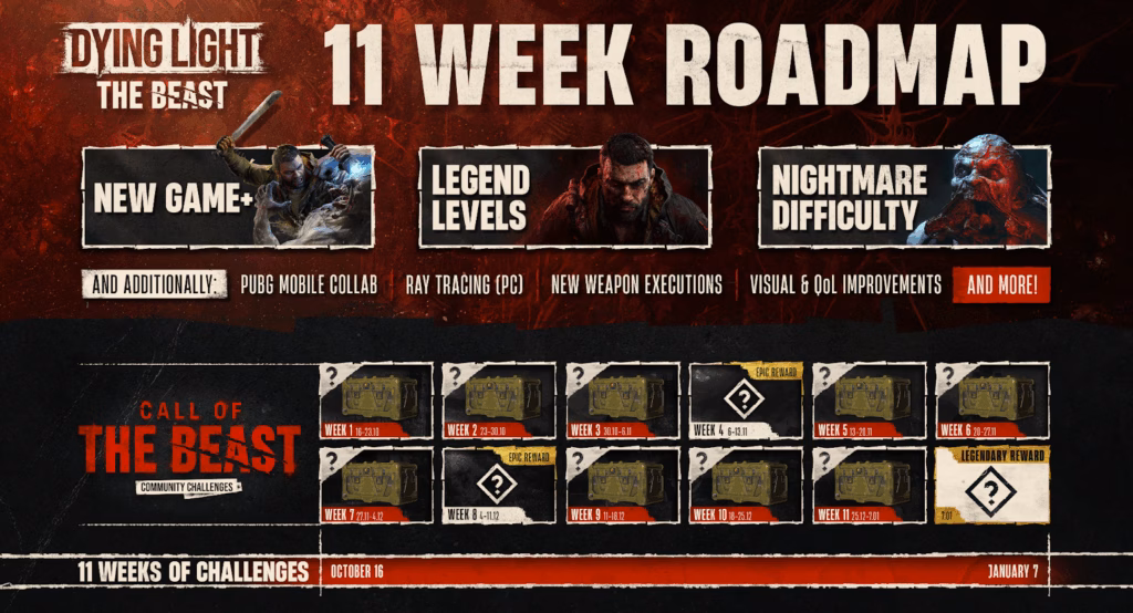 Parallel zur Roadmap ruft Techland die Spieler zur Initiative „Call of the Beast“ auf. Bei diesem globalen Community-Event sind alle Spieler dazu eingeladen, ihre Stärke gemeinsam zu beweisen und wöchentliche Ziele zu erreichen.