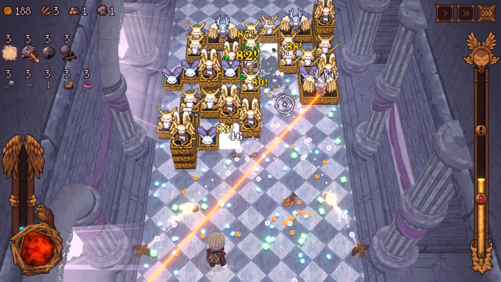 - Die Falknerin: Dieser Charakter feuert zwei Bälle gleichzeitig ab, die von einem Vogelpaar an den Bildschirmseiten gestartet werden. Dies sorgt für eine breite, geschwungene Streuung und völlig neue Angriffswinkel.